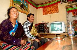 9月10日,兩位藏族老人在唐古拉山鄉(xiāng)生態(tài)移民小區(qū)自己家中收看電視節(jié)目。 從2003年國家實施三江源生態(tài)保護(hù)建設(shè)項目以來,整個三江源地區(qū)已有6000多戶、三萬多人從生態(tài)惡化嚴(yán)重地區(qū)搬遷出來,并在政府的幫助下融入城鎮(zhèn)。預(yù)計到2010年時,三江源地區(qū)為保護(hù)當(dāng)?shù)厣鷳B(tài)環(huán)境而實施搬遷的藏族牧民將達(dá)到10萬人。