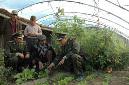 9月11日,武警官兵向巴克一家傳授蔬菜種植經(jīng)驗(yàn)。新疆塔什庫(kù)爾干縣塔合曼邊防派出所今夏為塔吉克族牧民巴克一家無(wú)償搭建的“愛(ài)民溫室”,9月份已經(jīng)小有收獲,巴克成為帕米爾高原第一家擁有自己的蔬菜溫棚的牧民。近年來(lái),新疆的高原牧民開(kāi)始改變以往的單一飲食習(xí)慣,逐漸接受并掌握蔬菜種植技術(shù)。