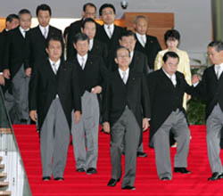 26日,在日本東京首相官邸,日本新首相福田康夫(前中)與內(nèi)閣成員集體亮相。當(dāng)天上午,日本福田康夫內(nèi)閣在皇宮舉行認(rèn)證儀式后正式成立。