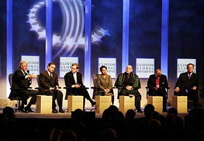 26日,美國前總統(tǒng)比爾·克林頓(左一)在紐約舉行的“克林頓全球倡議”第三屆年會上發(fā)言。臺上(左至右)依次為克林頓、沃爾瑪總裁斯科特、世界銀行行長佐利克、菲律賓總統(tǒng)阿羅約、阿富汗總統(tǒng)卡爾扎伊、諾貝爾和平獎得主圖圖大主教和美國前副總統(tǒng)戈?duì)。此次年會期間將討論包括全球變暖、普及教育等問題在內(nèi)的多項(xiàng)議題,吸引了政界、商界、文化界和國際組織機(jī)構(gòu)等領(lǐng)域的多位領(lǐng)袖和名流前來參加。