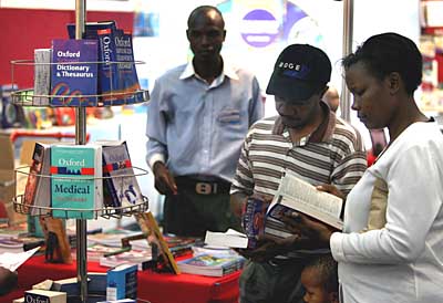 26日,參觀者在肯尼亞首都內(nèi)羅畢舉行的國(guó)際圖書展上選購(gòu)圖書。當(dāng)天,為期5天的第十屆內(nèi)羅畢國(guó)際圖書展在肯尼亞首都內(nèi)羅畢開幕,來自肯尼亞境內(nèi)外的60多家書商及出版商參展。一年一度的內(nèi)羅畢國(guó)際圖書展是肯尼亞規(guī)模最大的圖書展,在東非地區(qū)也頗有影響。
