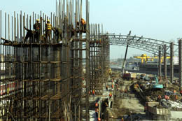 10月8日,工人們?cè)诎不崭逢?yáng)站工地施工。 目前,安徽省阜陽(yáng)火車站改造工程已進(jìn)入百日倒計(jì)時(shí)階段,中鐵四局的建設(shè)者們正緊張施工,確保按時(shí)、高質(zhì)量完工。阜陽(yáng)站是全國(guó)主要的民工集散地之一,每年發(fā)送旅客590多萬(wàn)人次,其中85%以上是農(nóng)民旅客,被當(dāng)?shù)厝罕娪H切地稱為“農(nóng)民車站”。