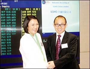 “上市以后,有人擔(dān)心我的頭發(fā)會因?yàn)樨?zé)任的增大而越來越少!”SOHO中國董事長潘石屹昨日在上市儀式上詼諧地說。不過,他和夫人張欣的財(cái)富卻因上市而越來越多了。以昨日(8日)SOHO中國收市價(jià)9.55港元計(jì)算,兩人所持股份的市值達(dá)317.45億港元,由此躋身中國富豪榜前列。 作為今年在港上市的明星地產(chǎn)股,SOHO中國此次集資128.6億港元,與今年上半年締造了內(nèi)地新首富的碧桂園旗鼓相當(dāng)。SOHO中國昨日開盤報(bào)10.1港元,較招股價(jià)8.3港元漲21.69%,午后雖隨大市走低有所回落,但仍收報(bào)9.55港元,較招股價(jià)高出15.06%。該公司目前總股本為50億股(不包括超額配售權(quán)行使所發(fā)股份),以昨日收盤價(jià)9.55港元計(jì)算,公司總市值為477.5億港元。
