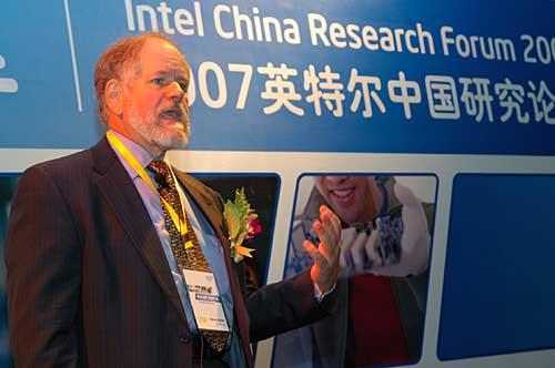 10月10日,“2007英特爾中國研究論壇”在北京舉行,論壇展示了來自英特爾中國研發(fā)機(jī)構(gòu)的40多項(xiàng)最前沿的科研成果。 本屆論壇以“源動創(chuàng)新,恒致千里”為主題,旨在與業(yè)界各方深入探討企業(yè)研發(fā)機(jī)制、可持續(xù)性創(chuàng)新發(fā)展等全球關(guān)注話題,并共同分享創(chuàng)新方法、成功經(jīng)驗(yàn)以及最新研究成果,感受由科技創(chuàng)新帶來的激情體驗(yàn)和強(qiáng)勁動力。會上,英特爾還展出了來自英特爾中國研究中心及英特爾亞太研發(fā)中心(APRC)的最新研究成果共40余項(xiàng)。 圖為英特爾公司企業(yè)技術(shù)事業(yè)部資深院士兼通信技術(shù)實(shí)驗(yàn)室總監(jiān)康凱文博士在論壇做主題為《建造英特爾創(chuàng)新發(fā)動引擎》的演講。 | |