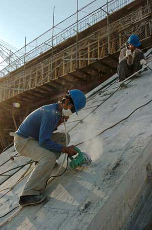 22日,兩名中國工人在蘇丹首都喀土穆以北的麥羅維大壩施工現(xiàn)場施工。麥羅維大壩位于喀土穆以北約450公里處的尼羅河上,由中國水利電力對外公司和中國水利水電建設(shè)集團(tuán)公司承建,是迄今為止中國企業(yè)承包的最大國際工程,也是蘇丹乃至非洲目前在建的最大水電項(xiàng)目。大壩于2003年7月開工,預(yù)期2008年完工。