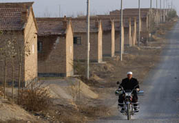10月30日,一位村民騎著摩托車經(jīng)過寧夏紅寺堡開發(fā)區(qū)生態(tài)移民搬遷戶住宅區(qū)。