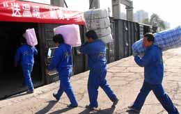 11月10日,工人在將捐獻物資裝上貨車。 今年以來,我國部分地區(qū)遭受了嚴重自然災害。嚴冬即將到來,黨中央、國務院十分關心災區(qū)人民和困難群眾的過冬問題,明確要求各地區(qū)各部門深入開展“送溫暖、獻愛心”活動,廣泛動員各方面力量,積極為災區(qū)人民和困難群眾捐款捐物,切實幫助他們排憂解難,以實際行動貫徹落實黨的十七大精神。中直機關各部門各單位積極響應中央號召,截至目前,中直機關已收到捐款約600萬元、棉衣棉被約三萬件。 |