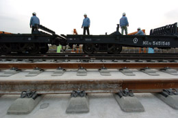 11月13日,中鐵二局施工車輛在為京津城際快速鐵路鋪軌。 當(dāng)天,京津城際快速鐵路在天津楊村開始鋪軌。京津城際快速鐵路是2008年北京奧運(yùn)會(huì)重點(diǎn)配套工程,全長(zhǎng)115公里,2005年7月4日開工建設(shè),將于今年完成軌道工程,明年一季度試運(yùn)行,將是中國最早建成的第一條設(shè)計(jì)時(shí)速350公里的高標(biāo)準(zhǔn)鐵路客運(yùn)專線。 |