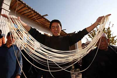 11月13日,循化縣新建村一位撒拉族青年在家中與朋友切磋拉面技藝。 今年以來,共青團(tuán)青海省委與國家開發(fā)銀行青海分行聯(lián)合向循化撒拉族自治縣新建村65位青年農(nóng)民發(fā)放總額為520萬元的“青年創(chuàng)業(yè)小額貸款”,并組織他們進(jìn)行拉面技術(shù)、市場分析和創(chuàng)業(yè)能力等方面的培訓(xùn),幫助當(dāng)?shù)厍嗄暝谌珖_展以拉面飲食經(jīng)濟(jì)為帶頭產(chǎn)業(yè)的創(chuàng)業(yè)活動(dòng)。 | |