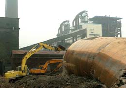 這是爆破后的現(xiàn)場(11月18日攝)。11月18日,南昌發(fā)電廠一座80多米高的小機(jī)組煙囪在巨響中轟然倒下,這是江西省實(shí)施電力“上大壓小”(上大機(jī)組關(guān)停小機(jī)組)的第一爆。
