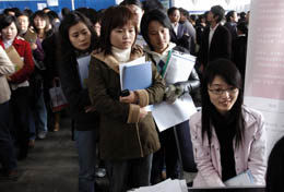 11月20日,畢業(yè)生在用人單位招聘攤位前洽談、應(yīng)聘。當(dāng)日,江蘇省暨南京市2008屆普通高校畢業(yè)生公益供需洽談會(huì)在南京國(guó)際展覽中心舉行,900多家用人單位提供2.5萬(wàn)多個(gè)職位,通過(guò)江蘇省高校畢業(yè)生就業(yè)網(wǎng)與用人單位對(duì)接、匹配而篩選出的五萬(wàn)多名畢業(yè)生免費(fèi)入場(chǎng)應(yīng)聘。江蘇省2008屆普通高校畢業(yè)生達(dá)42.7萬(wàn)人,比2007年增加七萬(wàn)多人,畢業(yè)生人數(shù)再創(chuàng)歷史新高。 |
