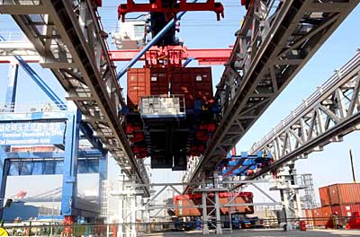 11月24日,由上海振華港機(jī)集團(tuán)自主研發(fā)制造的立體分配式高效集裝箱自動(dòng)化碼頭裝卸系統(tǒng),在振華港機(jī)長(zhǎng)興島基地為國(guó)內(nèi)外專家演示。該系統(tǒng)全部采用自動(dòng)化操作,大大提高了標(biāo)準(zhǔn)集裝箱的裝卸效率。這是起吊的集裝箱由無(wú)人駕駛軌道車從鋼橋上自動(dòng)轉(zhuǎn)到堆場(chǎng)。 | |