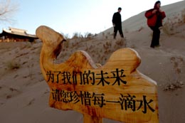 11月29日,幾名游客從月牙泉旁矗立的節(jié)水宣傳牌旁走過。 近日,為有效遏制敦煌生態(tài)環(huán)境惡化勢(shì)頭,保護(hù)月牙泉、鳴沙山這一沙泉相伴的自然奇觀,甘肅省啟動(dòng)月牙泉景區(qū)治理工程。該工程計(jì)劃投資7081萬元,通過月牙泉水位下降應(yīng)急治理工程和鳴沙山山體保護(hù)工程,治理流沙對(duì)月牙泉的侵害,對(duì)其周圍區(qū)域生態(tài)環(huán)境進(jìn)行保護(hù)。 |