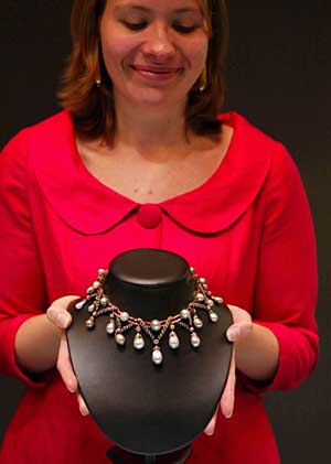 11月27日,工作人員展示一款天然珍珠鉆石紅寶石項鏈。這串項鏈曾屬于法國末代皇后瑪麗。當日,香港舉行瑰麗珠寶展,展品將于12月12日由英國倫敦佳士得拍賣行拍賣。