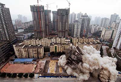 12月6日,位于重慶市江北區(qū)歐式一條街的“爛尾樓”米蘭大廈A棟25層塔樓被成功爆破拆除,這是迄今為止重慶主城區(qū)用爆破方式拆除的最高建筑。米蘭大廈于1997年開工建設(shè),2000年工程停工成為爛尾樓,后被有關(guān)部門認(rèn)定為危房。據(jù)悉,在爆破拆除之后,開發(fā)單位將在原地建設(shè)一高一低雙塔樓高檔商務(wù)公寓。