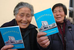 12月12日,山東無棣埕口鎮(zhèn)后埕村村民吳桂華(左)和吳秀芝領(lǐng)到了《新型農(nóng)村合作醫(yī)療證》。 當(dāng)日,山東省2008年度新型農(nóng)村合作醫(yī)療開始登記。山東省2007年進(jìn)一步新增新型農(nóng)村合作醫(yī)療試點(diǎn)縣(市、區(qū)),全省134個有農(nóng)業(yè)人口的縣已全部建立新型農(nóng)村合作醫(yī)療制度。 |