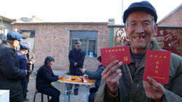 12月13日,河北省東光縣大曹村生活困難的五保農(nóng)民高興地領(lǐng)取供養(yǎng)金。國家級(jí)貧困縣東光縣今年籌措資金270多萬元,將全縣2200名五保農(nóng)民全部納入縣財(cái)政供養(yǎng)范圍,每月每人發(fā)放一百元供養(yǎng)金。