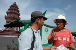 12月20日,在柬埔寨首都金邊的獨立碑前,來自中國江蘇的董寶玉(右)向當?shù)厝松l(fā)環(huán)保資料。59歲的董寶玉騎三輪車于10月3日從中國進入越南,本月12日抵達柬埔寨,一周后赴泰國。他的計劃是從亞洲開始,騎三輪車走遍世界,以此呼吁人們保護環(huán)境。