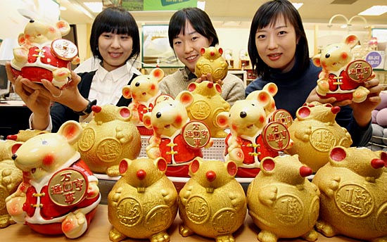 2008年1月1日,在韓國(guó)首都首爾的一家商場(chǎng),售貨員展示老鼠造型的存錢罐。2008年是農(nóng)歷鼠年,韓國(guó)商家借機(jī)推出了各種老鼠造型的用品。