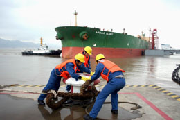 全國最大商用石油和保稅油品倉儲(chǔ)企業(yè)中化興中石油轉(zhuǎn)運(yùn)(舟山)有限公司所屬岙山基地,2007年年吞吐各類油品達(dá)1539.41萬噸。圖為一艘30萬噸級(jí)油輪“阿波羅榮耀”號(hào)裝載11萬噸燃料油靠泊在岙山基地。