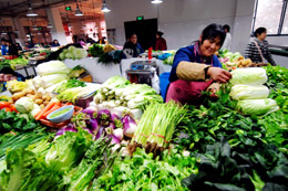 1月8日,一名蔬菜攤主在整理自家菜攤上的蔬菜。 為穩(wěn)定以豬肉為重點的副食品價格,杭州市不斷深化“微利肉”“讓利菜”等銷售活動,并把讓利銷售的品種范圍擴(kuò)大到禽蛋等主要副食品。為此,杭州市工商局等部門從2008年1月至3月繼續(xù)對市區(qū)農(nóng)貿(mào)市場的豬肉、大路蔬菜經(jīng)營戶適當(dāng)減免市場攤位費。自2007年8月份開展“微利售肉”活動以來,杭州市共有104家大型超市、農(nóng)貿(mào)市場和零售肉店參與了此項活動。 |