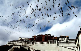 1月10日,一群野鴿子在布達(dá)拉宮上空翱翔。
