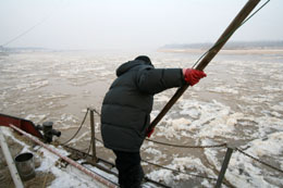 1月14日,河務(wù)人員在黃河濟(jì)南濼口段觀測流凌。