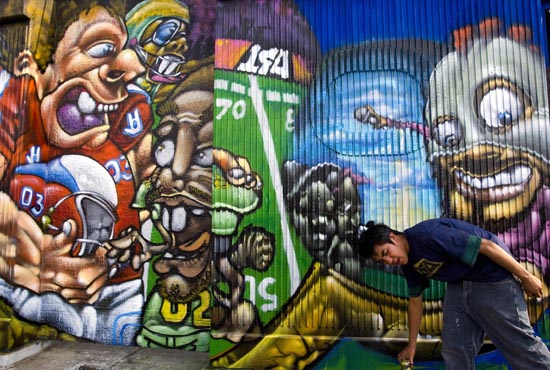 13日,一名參加涂鴉比賽的男子在墨西哥首都墨西哥城的阿茲特克體育場(chǎng)外墻上創(chuàng)作。為了減少在該體育場(chǎng)外墻上的亂涂亂畫,墨西哥城官方和阿茲特克體育場(chǎng)聯(lián)合舉辦了這次涂鴉比賽,比賽優(yōu)勝者獎(jiǎng)金為1500美元,入圍的300幅作品還被獲準(zhǔn)畫在體育場(chǎng)外墻上。