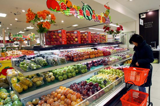 1月14日,顧客在上海一家大型超市的“臺(tái)灣寶島水果”專柜前選購(gòu)。據(jù)悉,2008年春節(jié)期間將有包括蓮霧、青檬、芭樂、楊桃、柳丁等約100噸臺(tái)灣水果供應(yīng)上海市場(chǎng)。