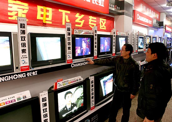 1月15日,四川省華鎣市雙河辦事處昭勛村的農(nóng)民在“家電下鄉(xiāng)”網(wǎng)點選購彩電。近日,四川省啟動“家電下鄉(xiāng)”試點工作。農(nóng)民購買補貼范圍內(nèi)的彩電、冰箱、手機類產(chǎn)品,憑有效證件可到當?shù)氐泥l(xiāng)鎮(zhèn)財政所申領(lǐng)“家電下鄉(xiāng)”補貼,標準為家電產(chǎn)品銷售價格的13%。