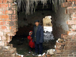 安徽省鳳臺縣桂集鄉(xiāng)后胡村村民陳勇與小女兒站在剛搬出的原住房里(1月15日攝)。他們現(xiàn)臨時住在鄰居家。 安徽省鳳臺縣桂集鄉(xiāng)后胡村,位于淮河支流的澮河邊。2007年夏,淮河發(fā)生了1954年以來最大的全流域洪水,后胡村嚴重受災(zāi),倒房近30戶。災(zāi)情發(fā)生后,當(dāng)?shù)卣媱潓?0戶災(zāi)民集中安置。災(zāi)民安置房設(shè)計標準為每戶125平方米的兩層小樓,標準偏高,除政府補貼外,每戶災(zāi)民需自籌6萬多元。但是,災(zāi)民普遍經(jīng)濟困難,無力承擔(dān)高昂費用,導(dǎo)致房屋建設(shè)后續(xù)資金中斷。工程自2007年12月初被迫停工以來,一直未得到妥善解決,被當(dāng)?shù)厝罕姺Q為“爛尾樓”。目前,災(zāi)民不得不繼續(xù)住在嚴重受損的房屋內(nèi)。 |