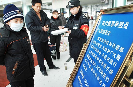 春運(yùn)前夕,江蘇省揚(yáng)州市鐵路火車站派出所專門成立“票源調(diào)查組”,通過向旅客調(diào)查車票來源來堵截高價(jià)票源,目前已端掉6個(gè)非法倒賣火車票的窩點(diǎn)。圖為旅客觀看高價(jià)票舉報(bào)點(diǎn)宣傳板。
