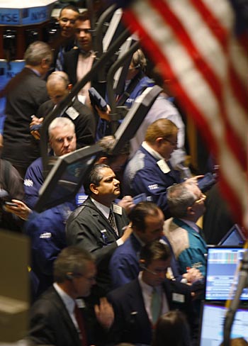 23日,交易員在美國紐約股票交易所里緊張工作。 當(dāng)天,道瓊斯指數(shù)波幅超過630點,為該指數(shù)2002年7月24日以來的最大波動。當(dāng)天早盤時,道指一度重挫323點,之后受金融類股突然走強帶動,收盤時比前一個交易日上漲298.98點,收于12270.17點,漲幅為2.50%。標(biāo)準(zhǔn)普爾500種股票指數(shù)比前一個交易日上漲28.10點,收于1338.60點。納斯達(dá)克綜合指數(shù)上漲24.14點,收于2316.41點。 | |