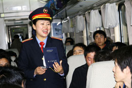 1月31日凌晨,列車長在車廂內(nèi)向旅客介紹停車時(shí)的安全事項(xiàng)。 當(dāng)日6時(shí)許,往返于沈陽和廣州間、因暴風(fēng)雪晚點(diǎn)近80個(gè)小時(shí)的T12/T14次列車在經(jīng)過了6天6夜的艱難旅程后,安全返回沈陽北站。面對幾十年不遇的冰雪災(zāi)害,沈陽鐵路局沈陽客運(yùn)段T12/T14次“三八乘務(wù)組”的64名女乘務(wù)員以頑強(qiáng)的意志和耐心細(xì)致的服務(wù)克服了列車嚴(yán)重超員、食品飲用水缺乏等諸多困難,贏得了旅客的理解和支持,與3000多名旅客一起平安返回家園。 |
