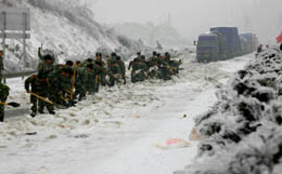 為盡快打通京珠大動脈,武警駐湖南某部出動了1200多名官兵日夜奮戰(zhàn)在京珠高速公路破冰鏟雪、維持交通秩序。廣州軍區(qū)某部出動3臺裝甲牽引車和2臺故障搶修車,在高速公路冰凍層最厚的地段輾冰除雪。