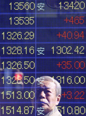 14日,在日本首都東京,一名男子在觀看顯示市場信息的電子顯示牌。日本內(nèi)閣府當日公布的初步統(tǒng)計數(shù)據(jù)顯示,去除物價變動因素后,2007年第四季度日本國內(nèi)生產(chǎn)總值比上季度增長0.9%,按年率計算增幅為3.7%,這是日本經(jīng)濟連續(xù)第二個季度出現(xiàn)增長。新華社/路透