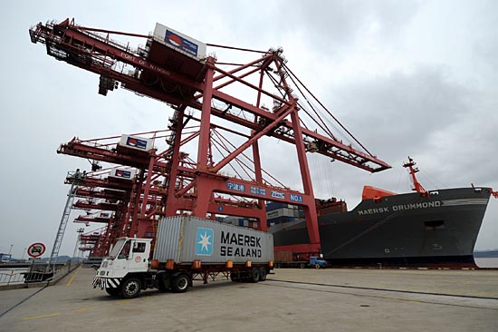 一輛集裝箱卡車駛出寧波港集團(tuán)有限公司北侖港區(qū)碼頭(2月18日攝)。 近年來,隨著國際航運(yùn)市場向大型化、深水化、集裝箱化的發(fā)展,寧波港集團(tuán)有限公司加快發(fā)展集裝箱運(yùn)輸業(yè),在世界港口中的地位迅速提升。2007年,該集團(tuán)集裝箱吞吐量達(dá)到900萬標(biāo)準(zhǔn)箱,預(yù)計(jì)2008年將突破1000萬標(biāo)準(zhǔn)箱。 | |