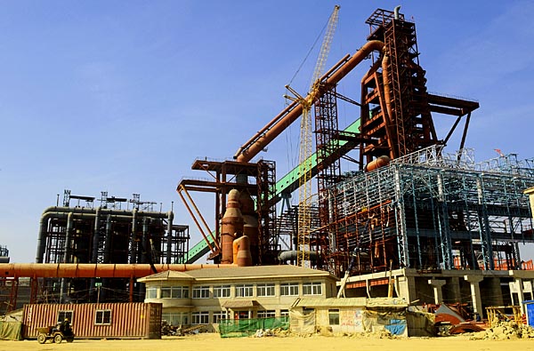 鞍鋼集團(tuán)在渤海灣建設(shè)的年產(chǎn)量650萬噸的鋼鐵廠將于今年下半年正式投產(chǎn)。鞍鋼集團(tuán)這一新廠緊臨營(yíng)口港,項(xiàng)目一期工程總投資約300億元,占地8.3平方公里,建設(shè)年產(chǎn)650萬噸精品鋼材生產(chǎn)線,包括200萬噸寬厚板、450萬噸熱軋板。圖為即將完成的鞍鋼鲅魚圈精品鋼材基地1號(hào)高爐。