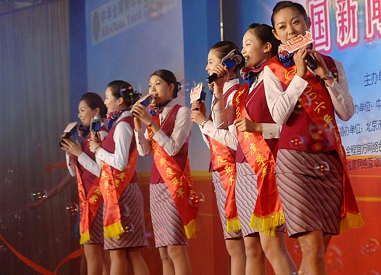 2月27日,南航空姐在演唱選拔賽主題曲。當天,中國南方航空公司招聘空姐新聞發(fā)布會在京舉行。據悉,本次招聘工作將從3月開始,預計于今年8月結束。新華社發(fā)