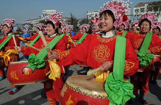3月4日,河南溫縣太極木蘭盤(pán)鼓隊(duì)的大媽大娘們?cè)诋?dāng)?shù)靥珮O文化廣場(chǎng)表演太極盤(pán)鼓。新華社 發(fā)