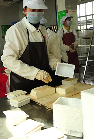 寧夏一家豆業(yè)公司工人正在包裝豆腐(3月4日攝)。