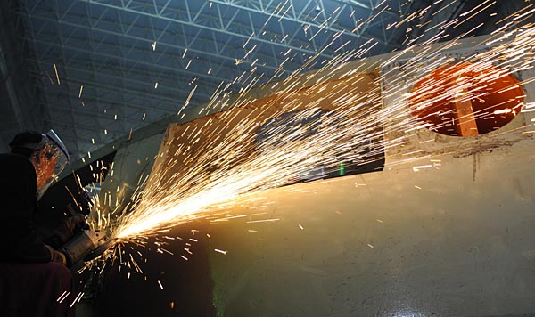 一名建設(shè)者在打磨三峽右岸電站19號水輪發(fā)電機組的機組頂蓋(3月5日攝)。