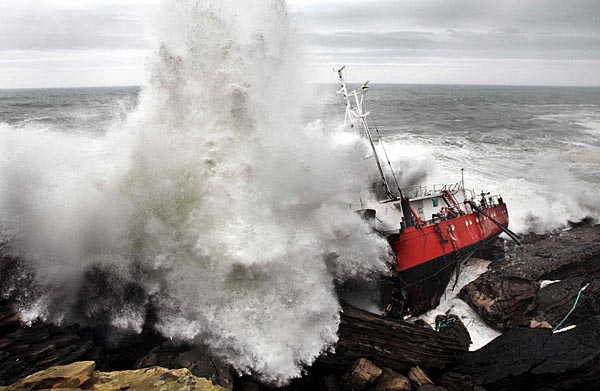 11日,在西班牙比斯開省附近的海灣,巨浪拍打著岸邊的一艘商船。一場強暴風(fēng)雨近日席卷了英倫三島和歐洲大陸西部的一些國家,造成許多地方交通受阻、供電中斷,并有人員受傷。新華社/路透