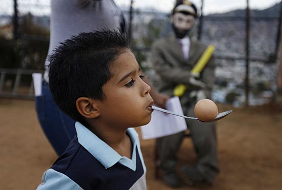 23日,在委內(nèi)瑞拉首都加拉加斯舉行的慶祝復(fù)活節(jié)的趣味比賽中,一名男孩用嘴叼著勺子運送雞蛋。加拉加斯當天舉行各種趣味比賽慶祝復(fù)活節(jié)。新華社/路透