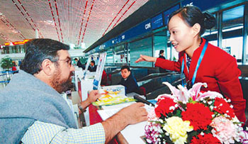 | 3號航站樓的工作人員在為乘客辦理手續(xù)。新華社記者 何俊昌