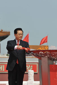 3月31日,中共中央總書記、國家主席胡錦濤出席北京2008年奧運(yùn)圣火歡迎儀式暨火炬接力啟動儀式。