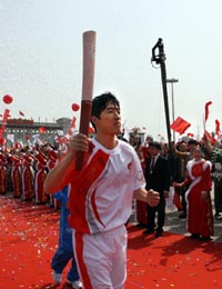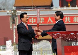 胡錦濤接過中共中央政治局委員、北京市委書記、北京奧組委主席劉淇手中的火炬。