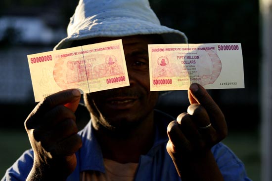 5日,一名津巴布韋人在首都哈拉雷展示新發(fā)行的5000萬津元紙幣。津巴布韋中央儲備銀行宣布,從4日起發(fā)行當(dāng)今世界貨幣中面額最大的5000萬津元紙幣,以緩解目前津巴布韋市面上的現(xiàn)金短缺問題。目前津巴布韋的通貨膨脹率達(dá)到100000%。