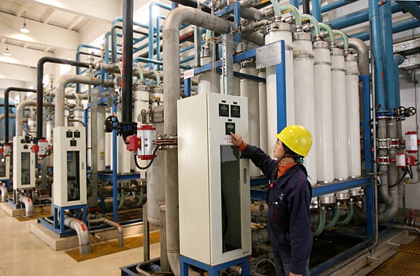 | 近年來,中國華電集團公司堅持科學發(fā)展觀,積極發(fā)展循環(huán)經(jīng)濟,推進資源、廢物綜合利用和再生資源、水資源的循環(huán)利用,圍繞環(huán)保、節(jié)能、高效,開發(fā)應用新技術(shù)、新工藝、新裝備,促進生產(chǎn)運營、基本建設(shè)及電站裝備領(lǐng)域的科技創(chuàng)新和技術(shù)升級。圖為華電新鄉(xiāng)發(fā)電有限公司一名技術(shù)人員在調(diào)節(jié)濾水裝置。 | |