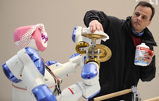 20日,一名參展人員在德國漢諾威的展覽場(chǎng)館內(nèi)擦拭機(jī)器人。德國2008漢諾威工業(yè)博覽會(huì)于4月21日至25日在這里舉行。來自世界約60個(gè)國家和地區(qū)的5100多個(gè)參展商將參加這次工業(yè)博覽會(huì)。新華社/法新